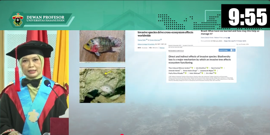Dalam pidato pengukuhannya yang berjudul “Tantangan dan Solusi Pengelolaan Sumber Daya Perairan di Indonesia dalam Perspektif Biodiversitas”, Prof. Nadiarti menyoroti pentingnya keanekaragaman hayati atau biodiversitas sebagai bagian dari batas aman eksploitasi lingkungan. Menurutnya, biodiversitas memiliki peran krusial dalam mendukung pembangunan berkelanjutan dan kesejahteraan manusia.